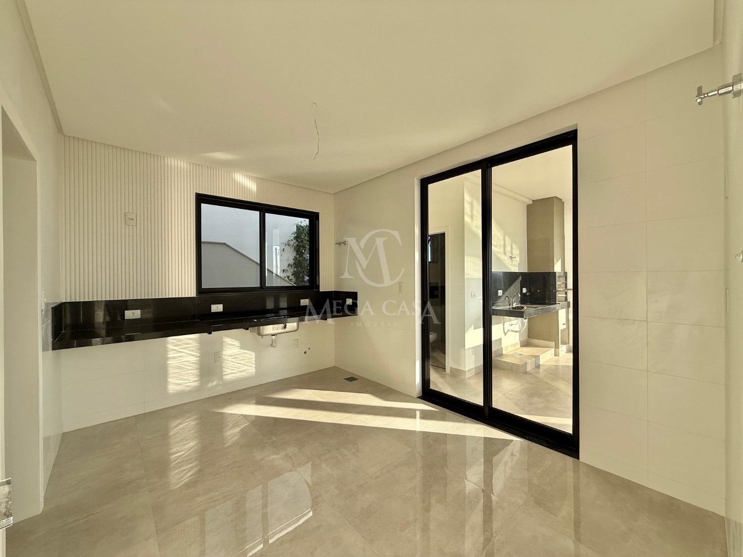 A cozinha é funcional e se integra perfeitamente à área de serviço.