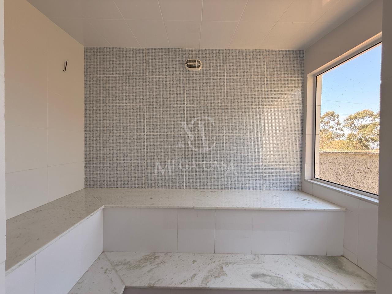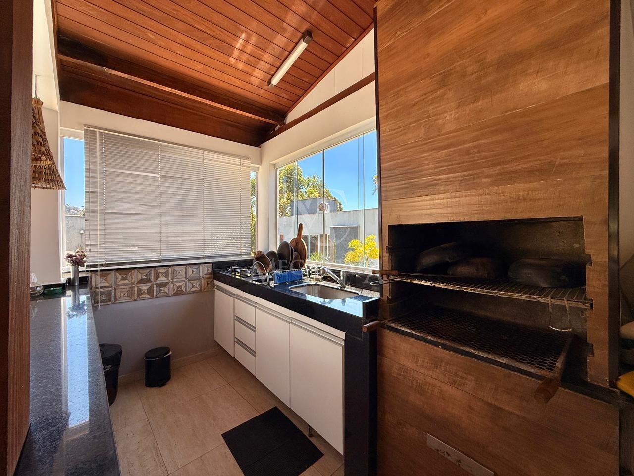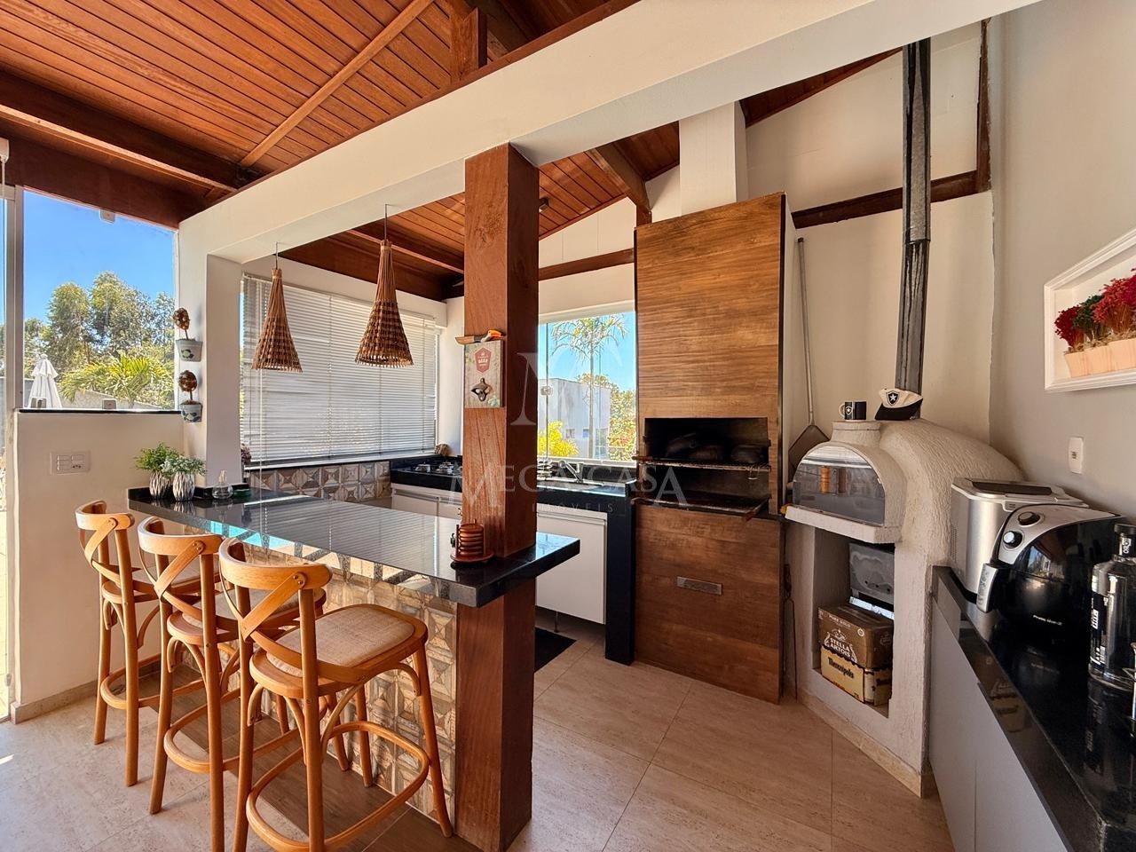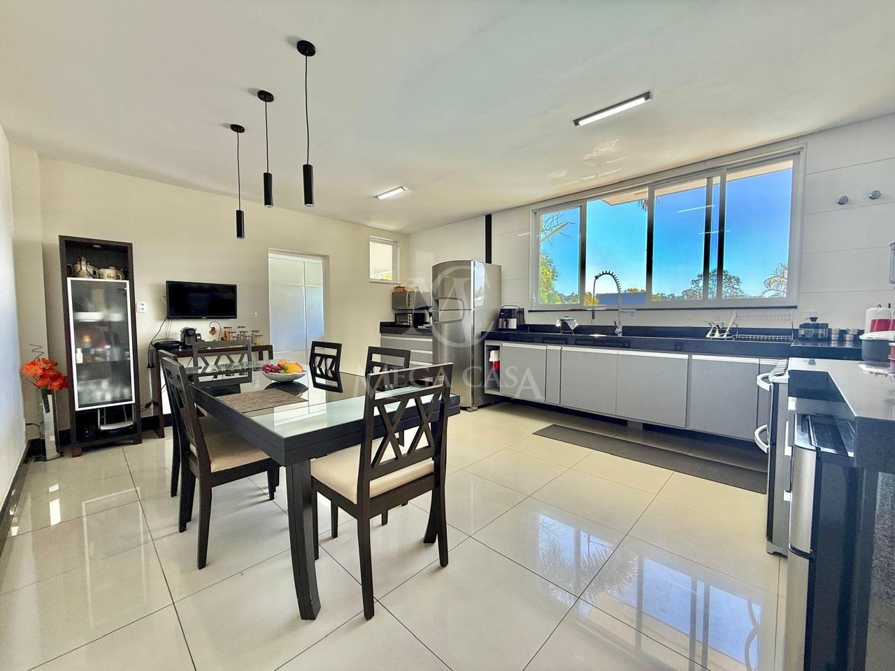 A casa conta com sala ampla para dois ambientes, cozinha moderna com planejados, coifa, cooktop, micro-ondas e forno elétrico, além de área de serviço independente.