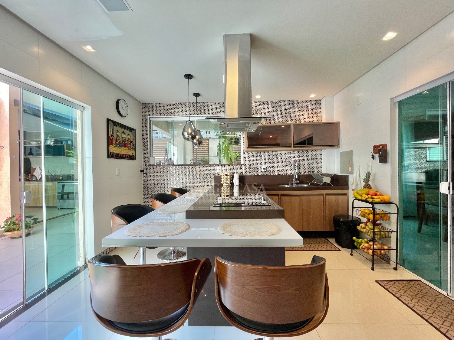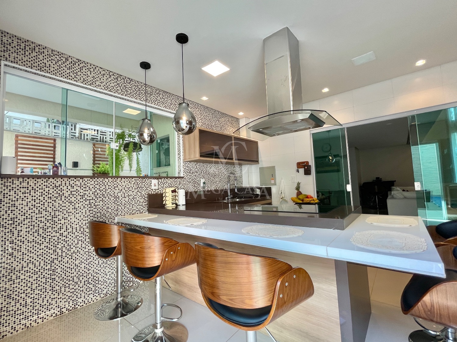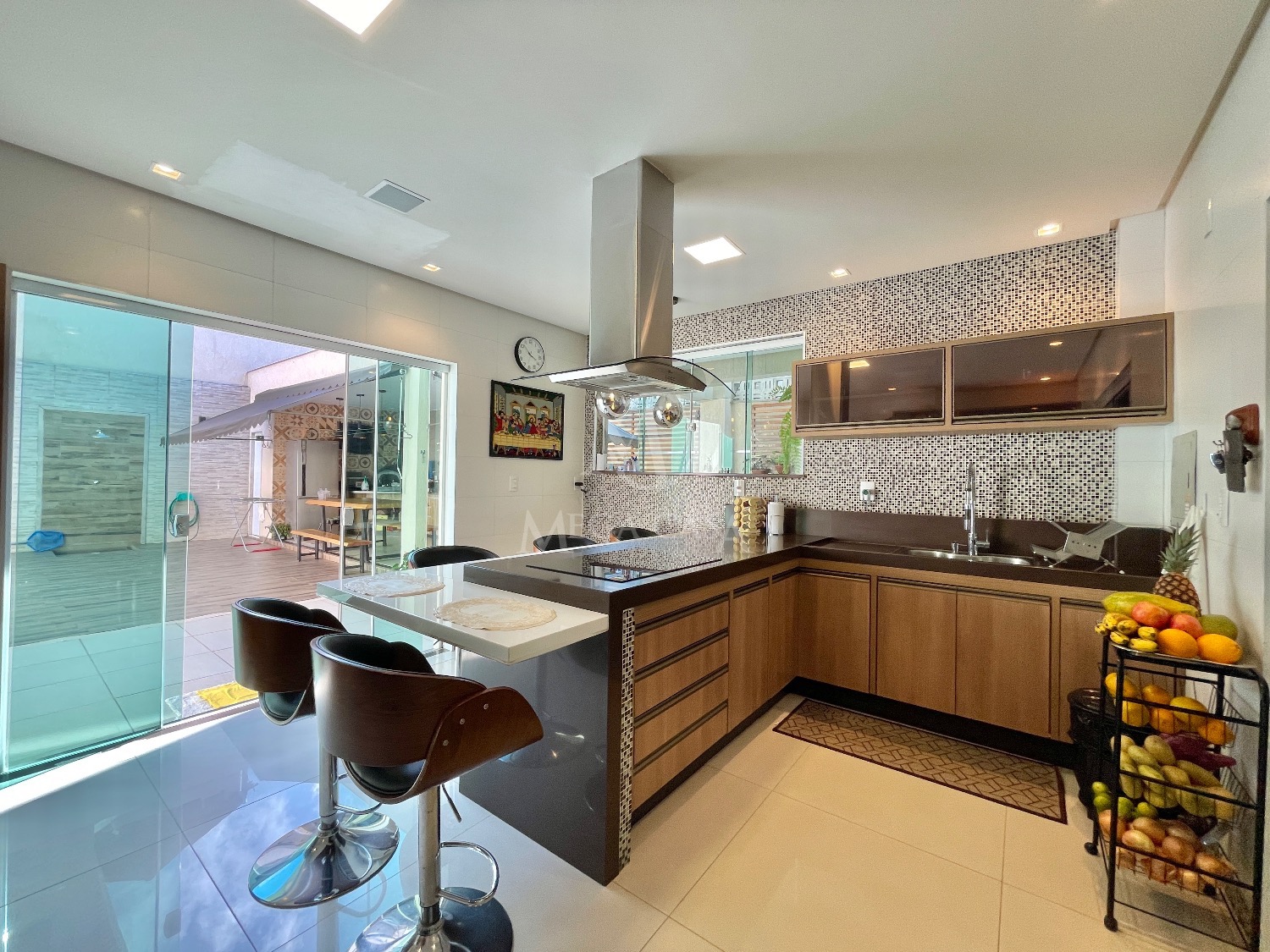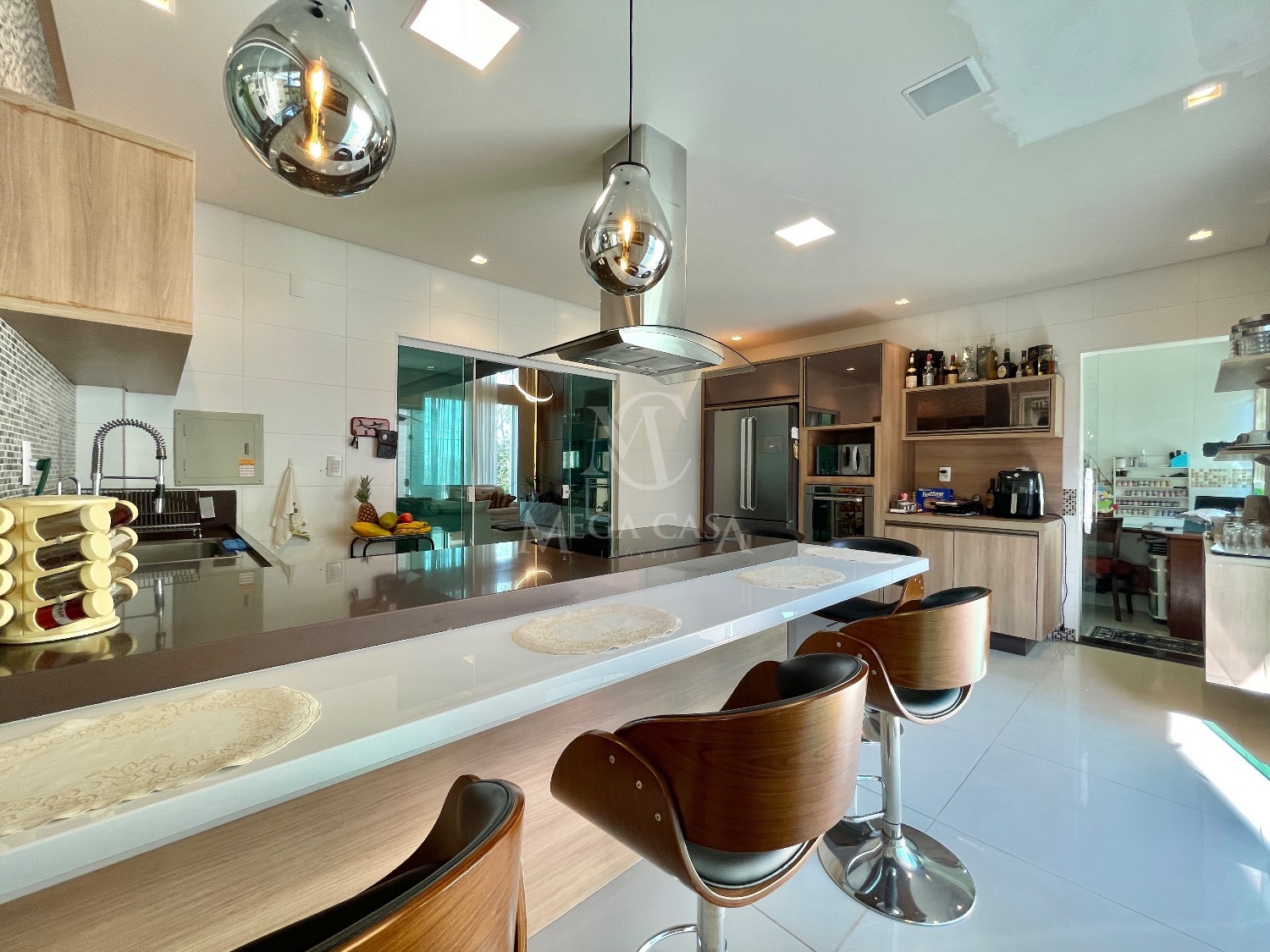 A cozinha é um dos grandes destaques, ampla, com ilha central, móveis planejados, fogão por indução, coifa, forno elétrico, geladeira, banquetas e luminárias.