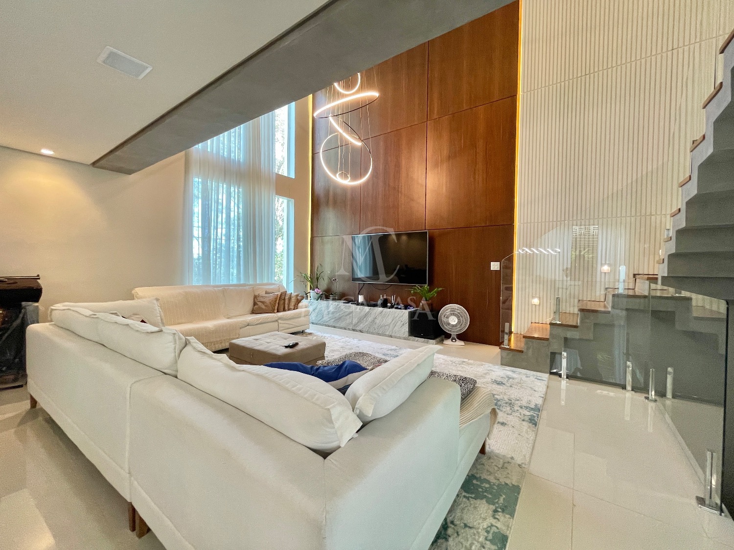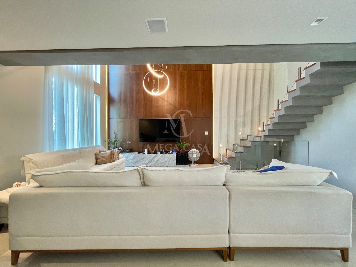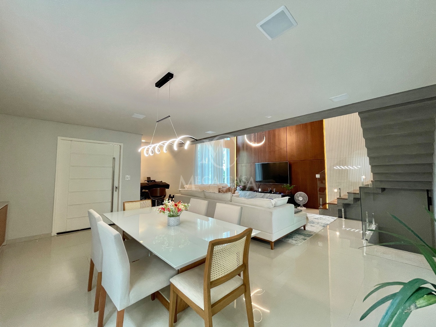 No primeiro pavimento, a sala ampla para dois ambientes já vem mobiliada com sofá moderno em linho, painel, TV de 70 polegadas, sistema de som, cortinas, luminárias e lareira ecológica, que deixa o ambiente ainda mais acolhedor.