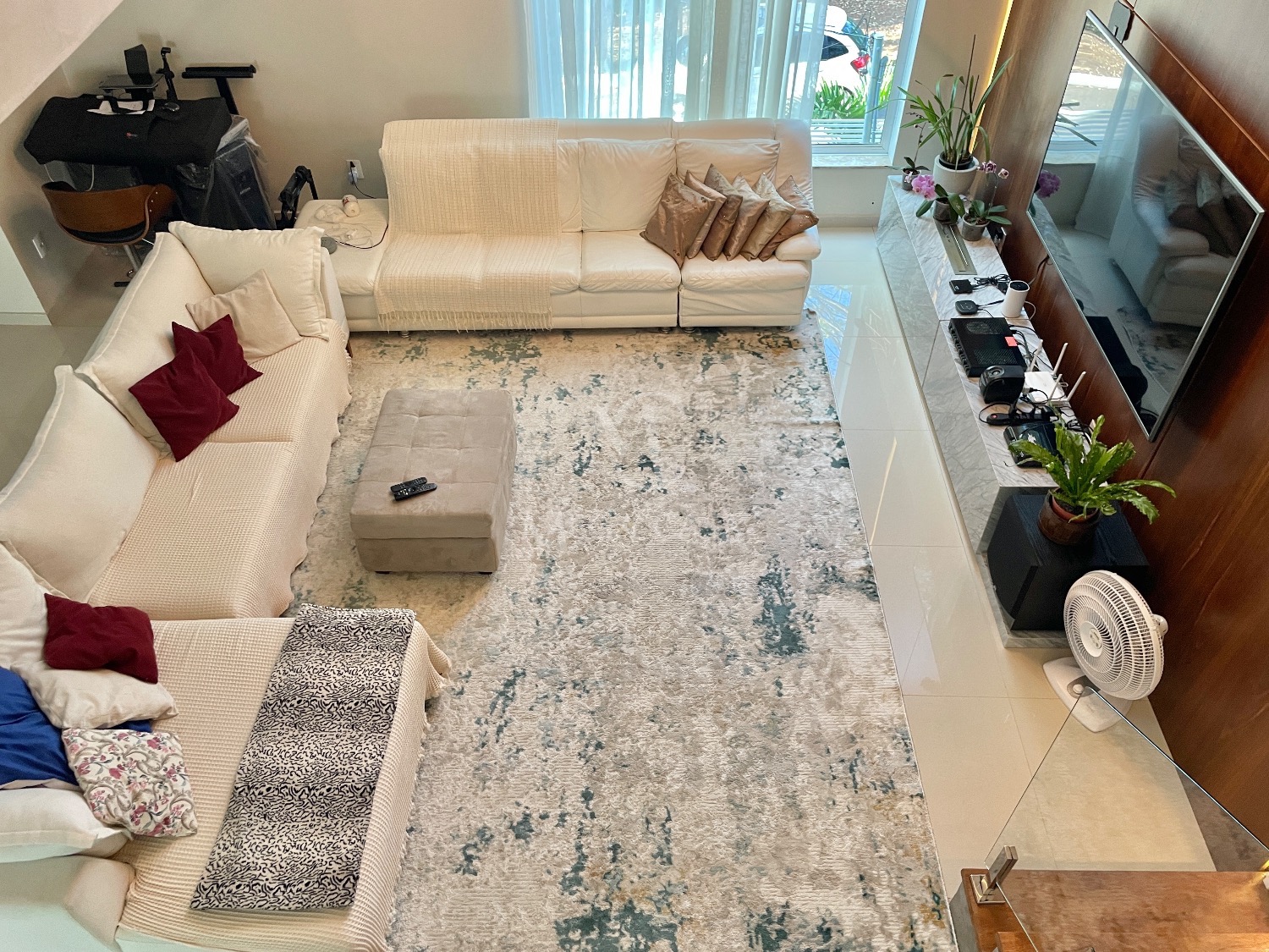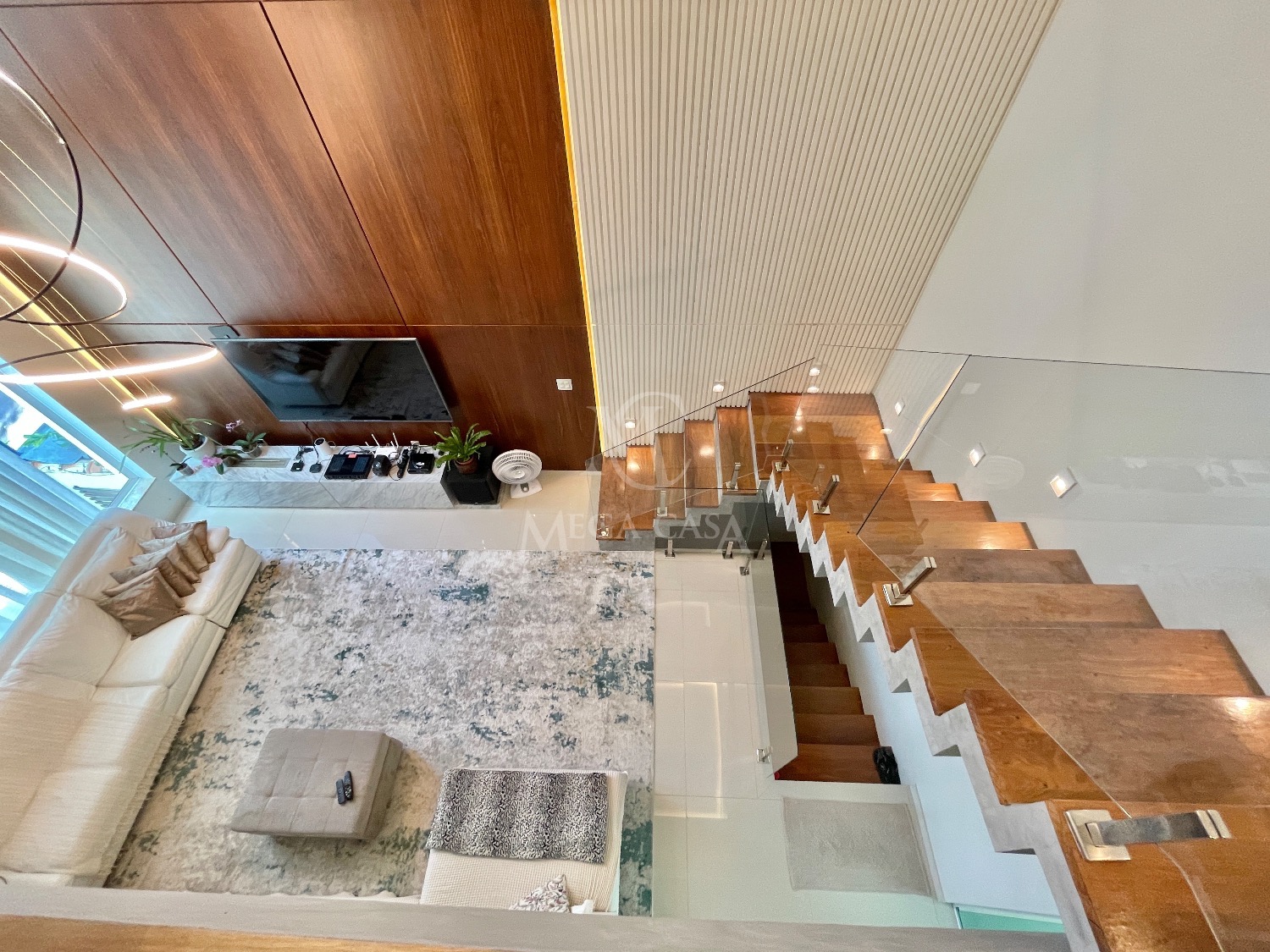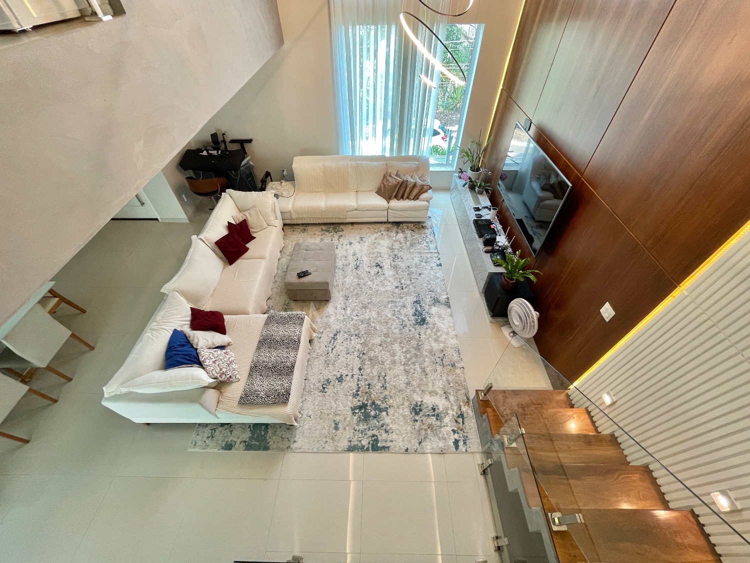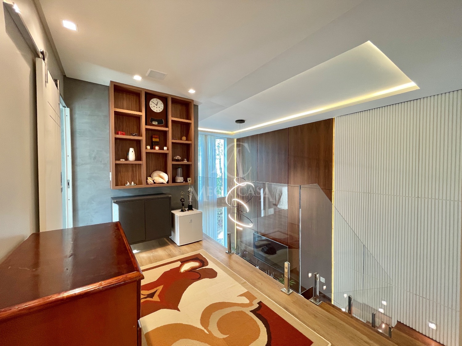 No primeiro pavimento, a sala ampla para dois ambientes já vem mobiliada com sofá moderno em linho, painel, TV de 70 polegadas, sistema de som, cortinas, luminárias e lareira ecológica, que deixa o ambiente ainda mais acolhedor.