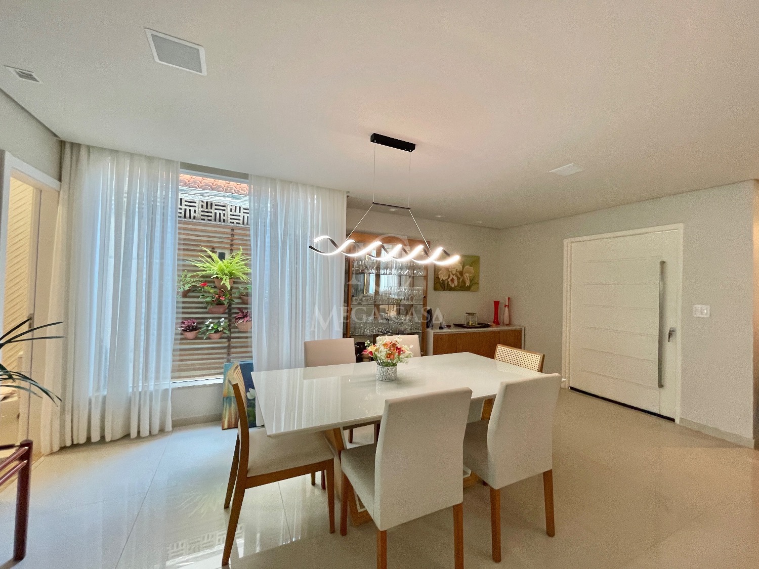 O espaço de jantar conta com mesa, cadeiras e cortinas sob medida. Há também um lavabo elegante.