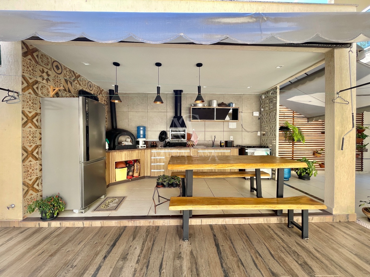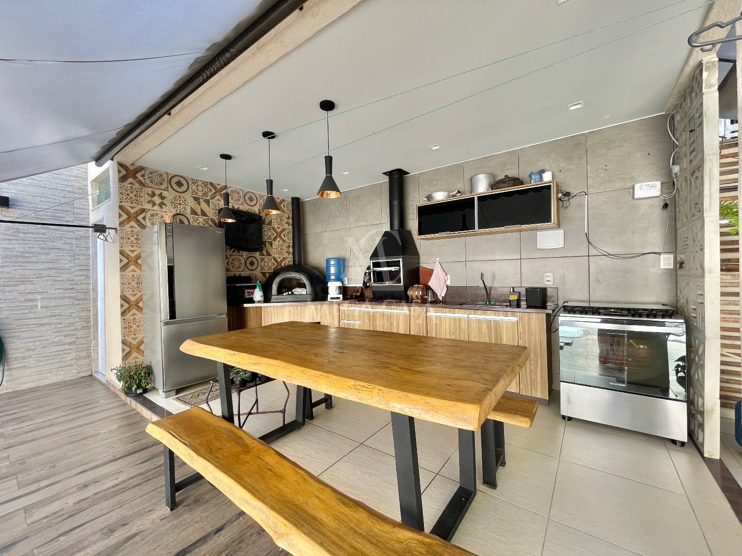 A área gourmet possui mesa de madeira, churrasqueira, forno de pizza e armários.