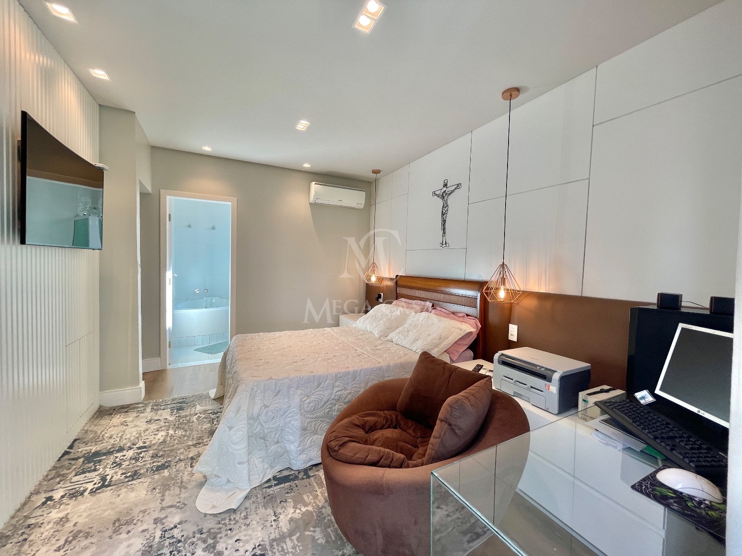 A suíte principal é um verdadeiro refúgio, com closet, banheiro com armários e uma banheira de hidromassagem.