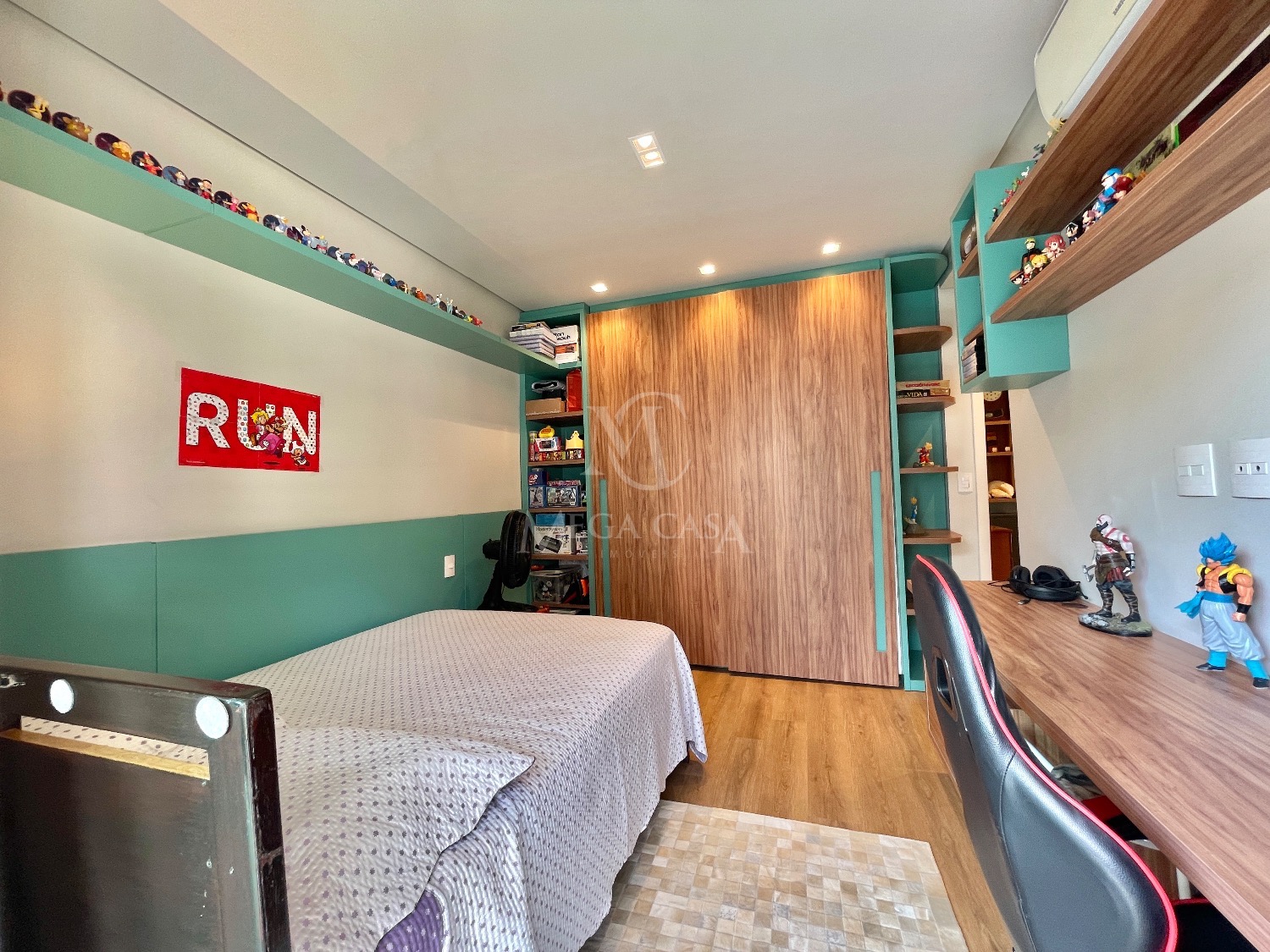 No segundo andar, a área íntima conta com uma charmosa antessala com estante planejada e três suítes completas, todas com varanda, móveis planejados, cortinas e ar-condicionado.